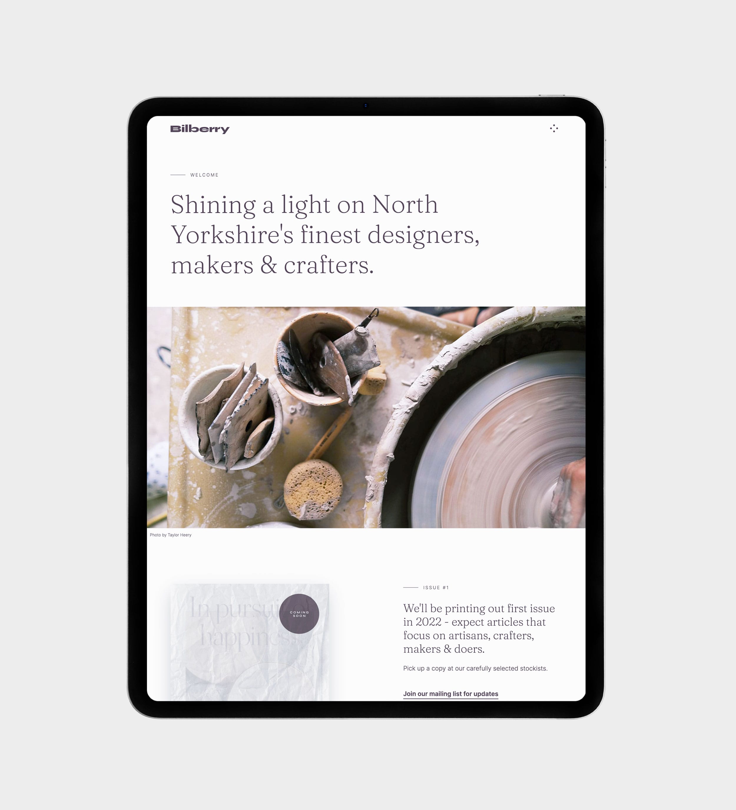 A platform for exceptional artisans to grow their audiences via its printed publications, events and online directory. Bilberry's mission is to enable independent creatives and businesses to flourish, gain the support of their local community and ultimately make a living from their craft.